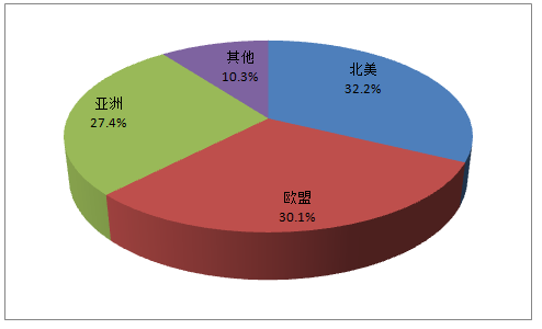 下面一起來(lái)回顧一下2016年展示架行業(yè)市場(chǎng)占比,目前,北美仍是全球最大的展示架市場(chǎng),2016年北美展示架市場(chǎng)占全球市場(chǎng)的32.2%,其次是歐盟占30.1%,亞洲地區(qū)占27.4%。下面餅圖是2016年全球展示架行業(yè)市場(chǎng)格局占比